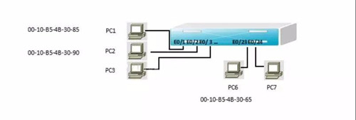 假设主机pc1向主机pc7发送一个数据帧,该数据帧被送到交换机后,交换机首先查MAC地址表,发现主机pc7连接在E0/24接口上,就将数据帧从E0/24接口转发出去。